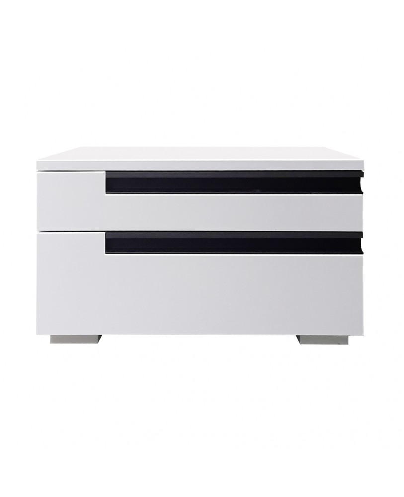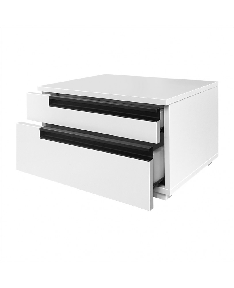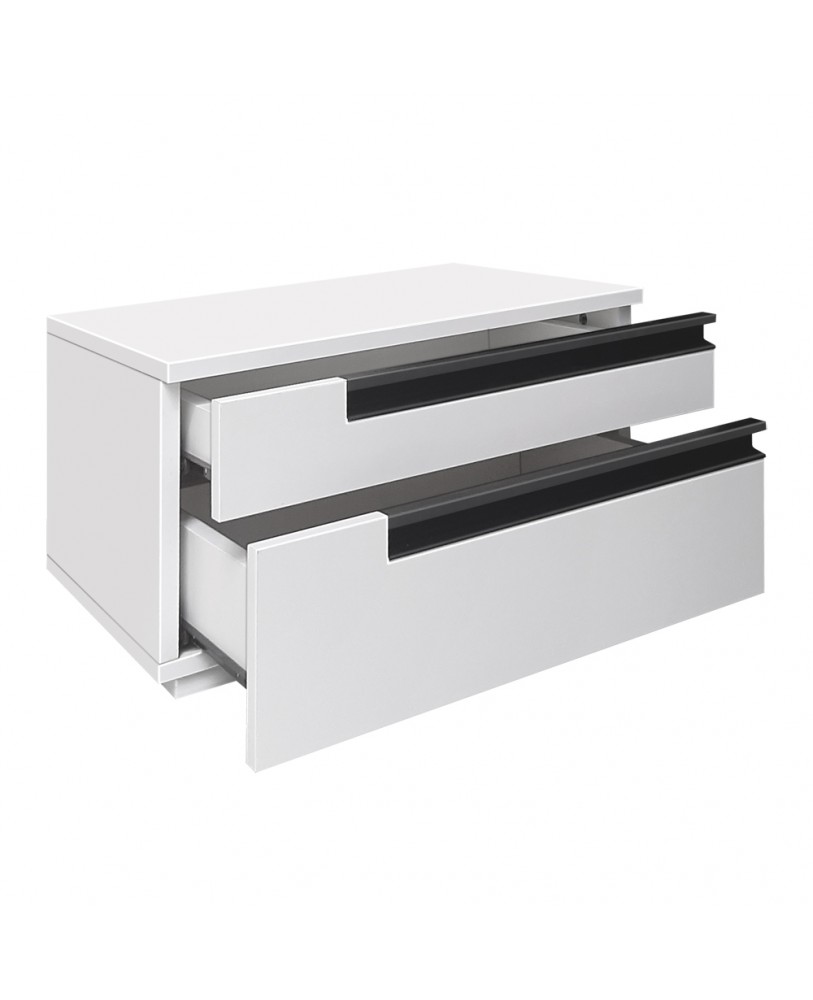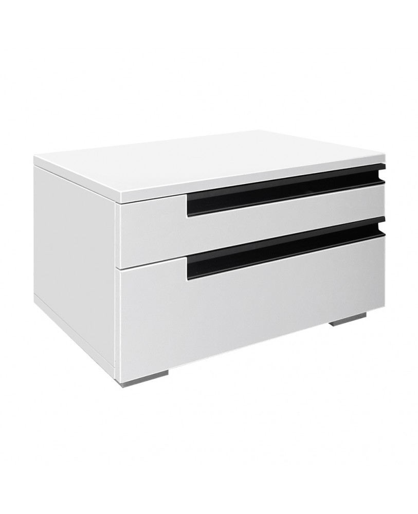 Setul de 2 noptiere Santa Fe, face parte din garnirtura pentru dormitor Santa Fe . Executata din pal melaminat de 18mm grosime, nuanta alb, are aplicat cant ABS 0,4mm. Noptiera este compusa din 2 sertare inegale . Sertarele , pentru usurinta manipularii, functioneaza pe glisiere cu role. Manerele metalice aplicate sunt ingropate pe muchie pe o lungime de 3 sferturi din totalul sertarului si sunt negre. Noptiera are 4 picioare plastic gri deschis aplicate pe margini.